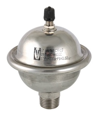 ОписаниеМембранный гаситель гидроударов VT.CAR 19 предназначен для компенсации скачков давления, возникающих при резком открытии или закрытии запорной арматуры в квартирных системах водоснабжения. Устройство также играет роль расширительного бака, принимающего избыток объема воды, который возникает в трубах при естественном нагреве в отсутствие водоразбора. Компенсатор гидроударов VT.CAR 19 представляет собой миниатюрный бак из нержавеющей стали марки AISI 304L с внутренней разделительной мембраной из эластомера EPDM. Небольшие выпуклости на поверхности мембраны обеспечивают ее неплотное примыкание к корпусу и максимальную площадь контакта мембраны с транспортируемой средой. Емкость гасителя гидравлических ударов VT.CAR 19 – 0,162 л, заводская настройка давления в воздушной камере – 3,5 бара, максимальное рабочее давление в защищаемом квартирном водопроводе – 10 бар, предельное давление при гидроударе – 20 бар, максимальная рабочая температура – 100 °С. Диаметр присоединительной резьбы – 1/2".